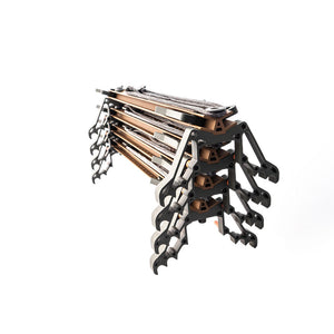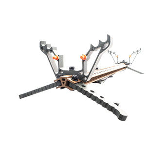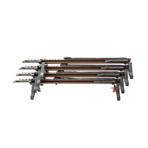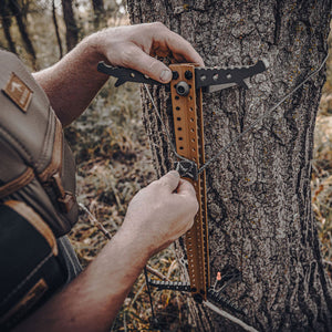 The Tethrd Skeletors are the best mid-priced portable climbing stick on the planet. The Skeletors are designed to be budget friendly, but still include many of the features we engineered into the Tethrd One Sticks. The Skeletors are built with a folding dual step design that folds AWAY from the tree. Folding away from the tree gives the hunter more room for their feet when climbing. The Skeletors attach to the tree with our patented DynaLite rope and tab rated for 300lb breaking at 2000lb in testing. It's the most user friendly, lightweight, simple, and fast connection method in history. There are no heavy buckles. There are no mechanical pieces. Stacking your Skeletors for transport is a breeze with our built in StickLoc pin system. Simply align the pins and stack away.
